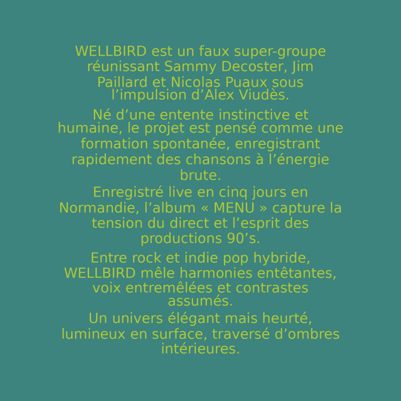 Il s’est enrichi de nouvelles voix singulières : le songwriting à l’os et l’abrasivité grunge de NARROW TERENCE, le crooner glam rock lumineux OH ! TIGER MOUNTAIN, l’indie pop hybride, élégante et insoumise de WELLBIRD, l’univers singulier de l’organiste CHARLIE O., ainsi que la collaboration intense de VILLENEUVE & MORANDO feat. VACΛRME, née dans le cadre du Festival Yeah!.
